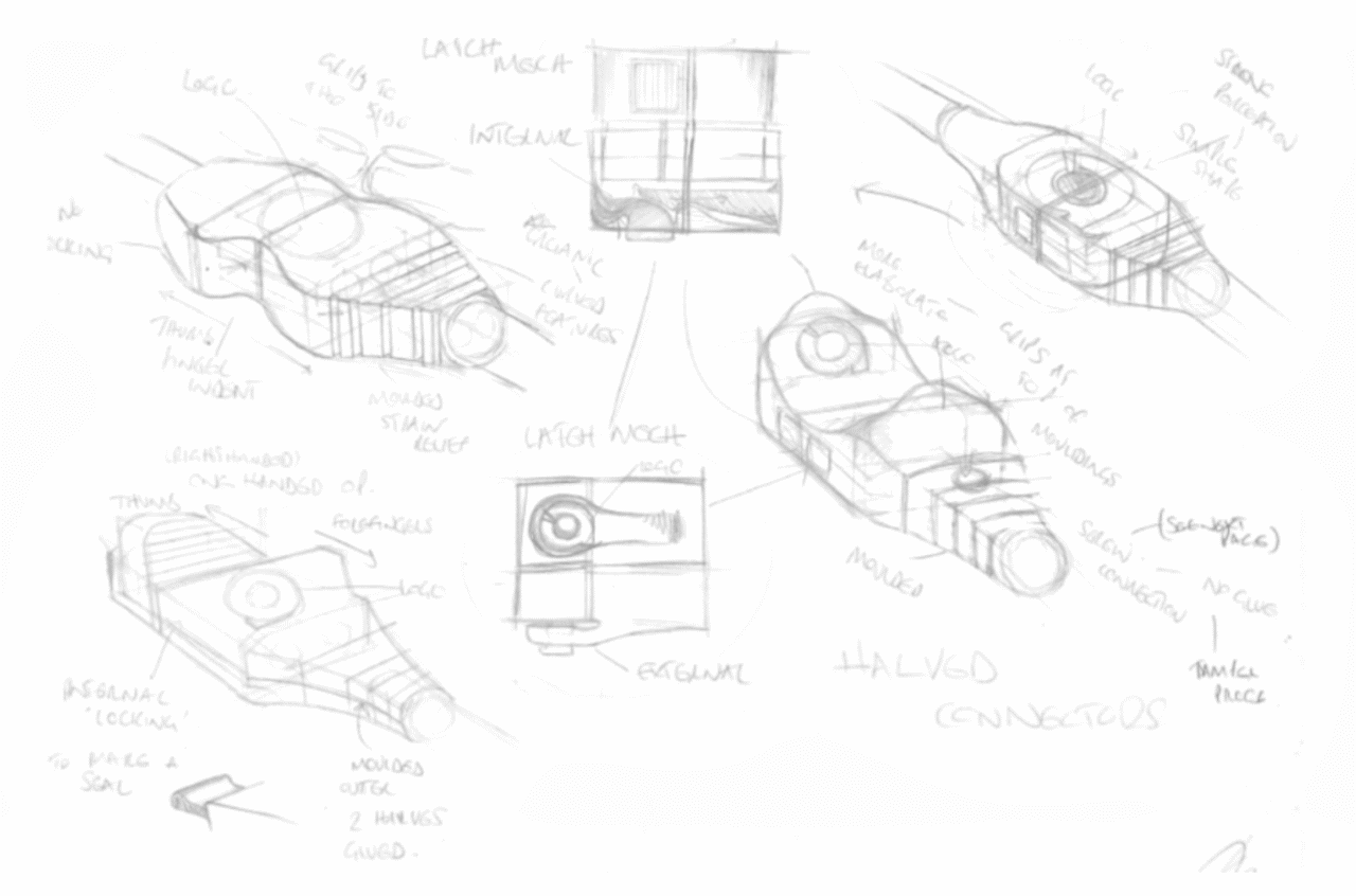Initial concept generation through hand sketches. Review meeting to gain feedback and progress 2 concepts into detailed development.